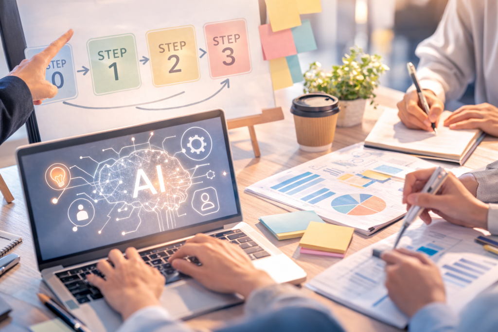 社員向けのAI研修を企業のニーズに合わせてカスタマイズ。STEP 0〜3の段階的プログラムで確実に定着させます。