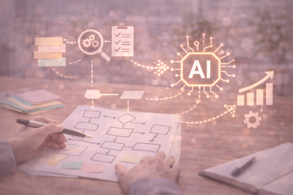 現在の業務フローを整理し、AIで効率化できるポイントを洗い出して改善案をご提案します。